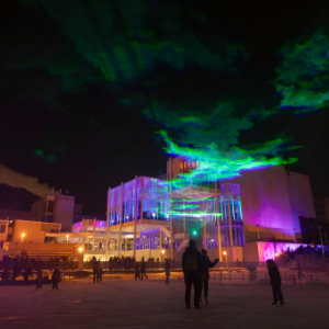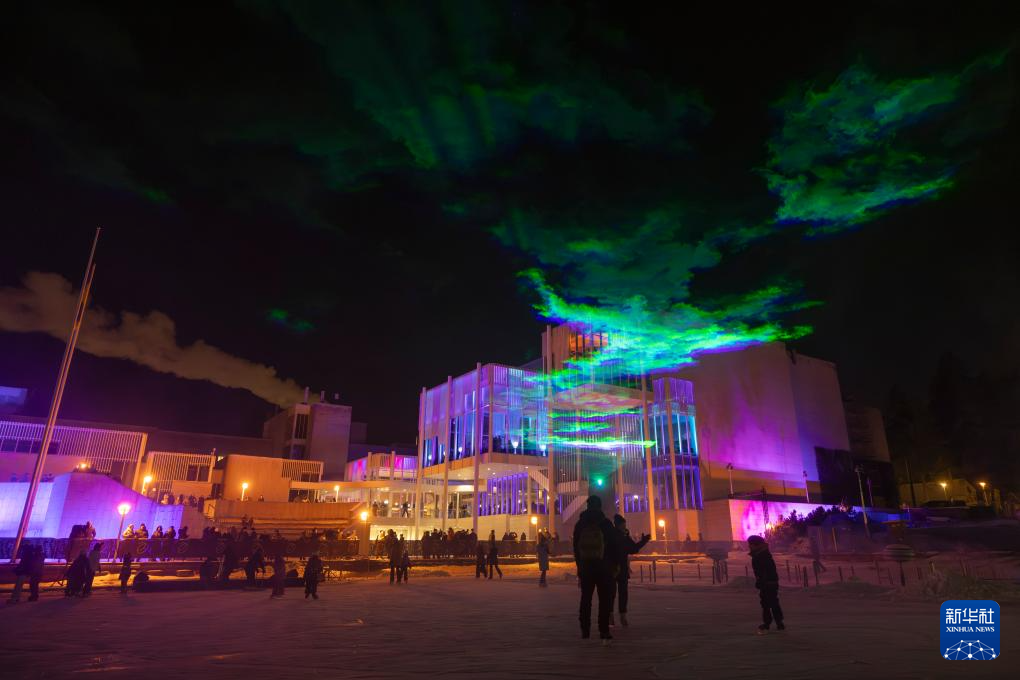 2025年12月31日,人们在芬兰南部城市埃斯波举行的“北极光”主题迎新年灯光秀活动现场欣赏灯光艺术作品《北极光》。