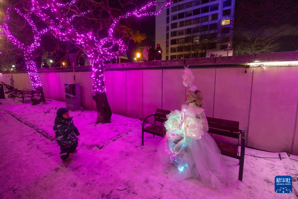 2025年12月31日,在芬兰南部城市埃斯波举行的“北极光”主题迎新年灯光秀活动上,孩子与身着发光服装的表演者互动。