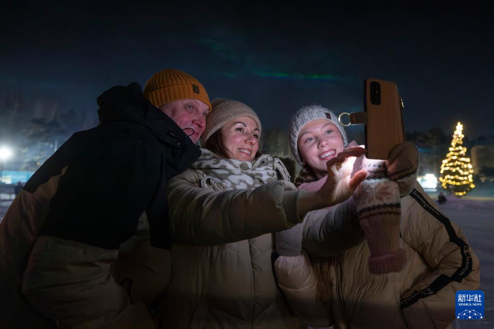 2025年12月31日,在芬兰南部城市埃斯波举行的“北极光”主题迎新年灯光秀活动现场,人们自拍留念。