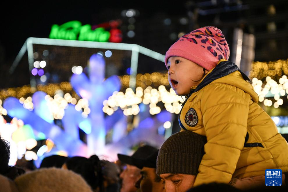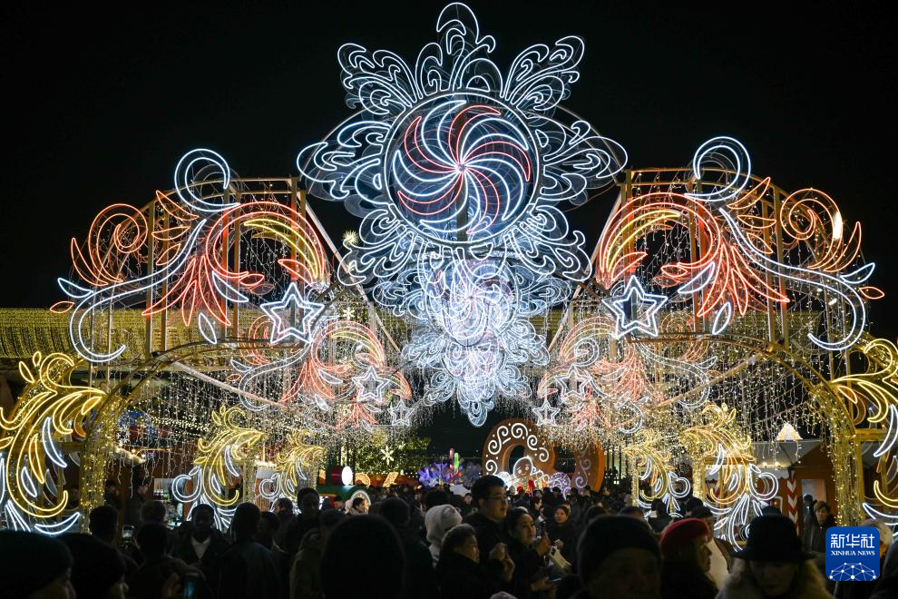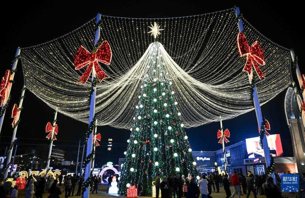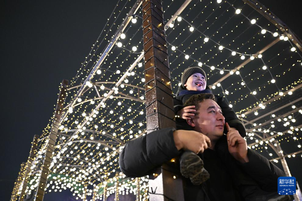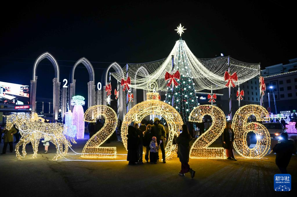 新年前夕,哈萨克斯坦第一大城市阿拉木图街头彩灯闪耀,节日气氛浓厚。