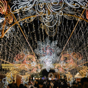 2025年12月31日,人们走过哈萨克斯坦阿拉木图的新年灯饰。