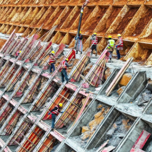 1月2日,在位于湖南省永州市新田县龙泉街道石甑源村的桂(东)新(田)高速建设工地,工人们进行防护坡施工作业(无人机照片)。