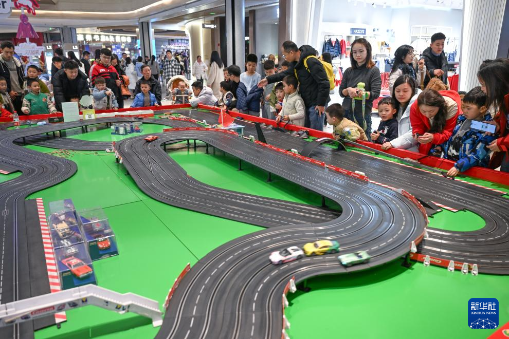 1月2日,在重庆两江新区一商场内,小朋友体验赛车玩具。