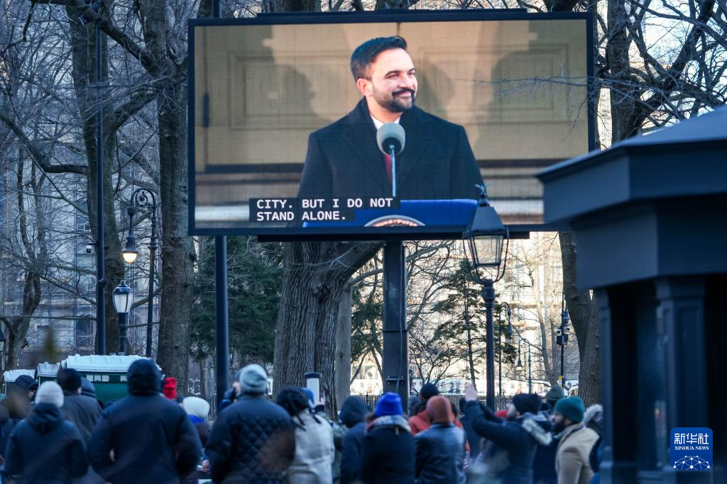 1月1日,在美国纽约,街头大屏幕播放祖赫兰·马姆达尼在就职典礼上的讲话。