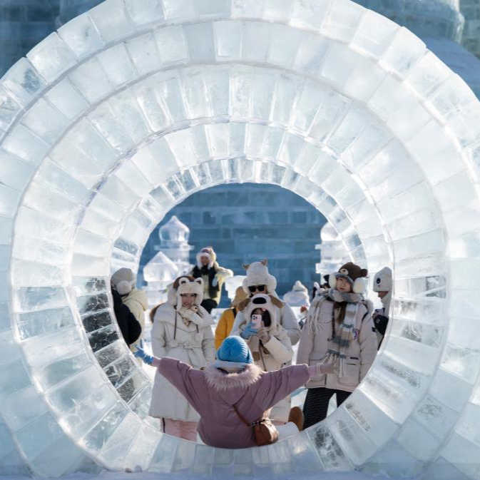 1月2日,人们在哈尔滨冰雪大世界园区拍照。