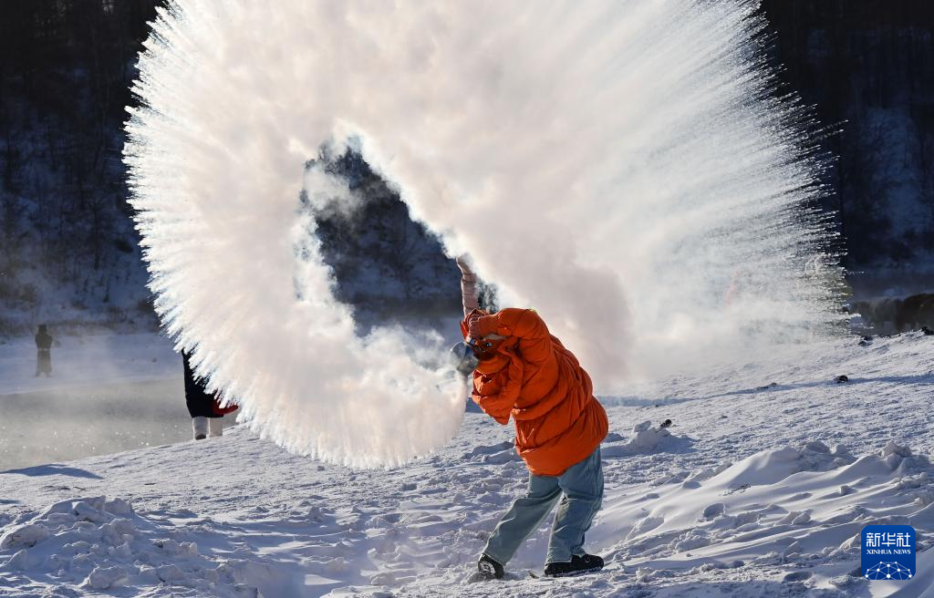 2026年1月1日,在内蒙古兴安盟阿尔山市,游客在哈拉哈河畔体验泼水成冰。