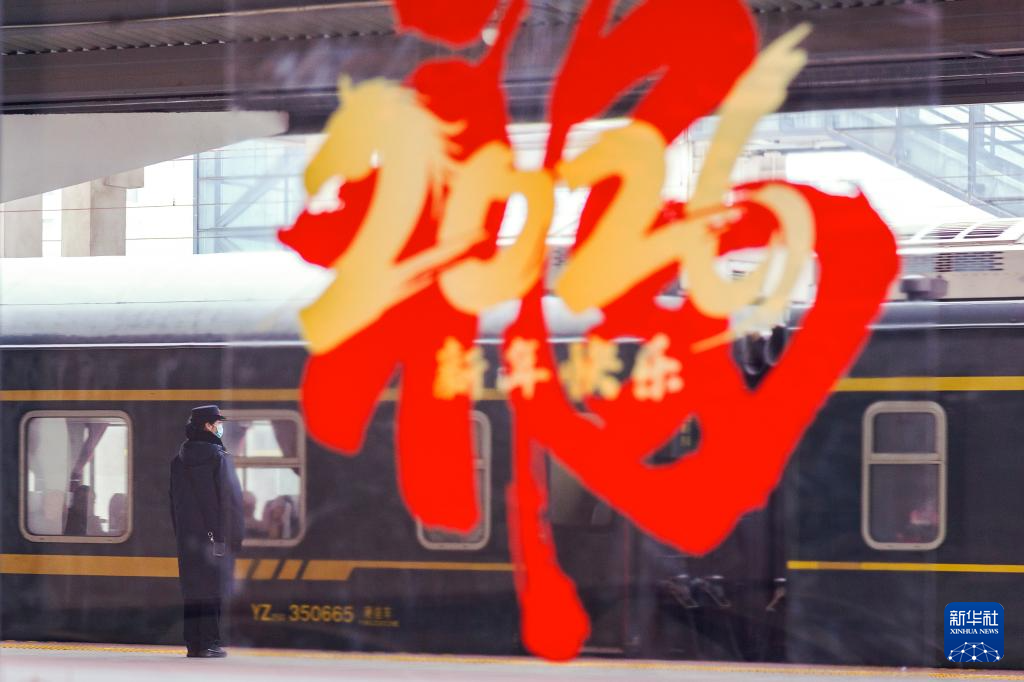 2026年1月1日,铁路客运工作人员在陕西咸阳车站迎接进站列车。