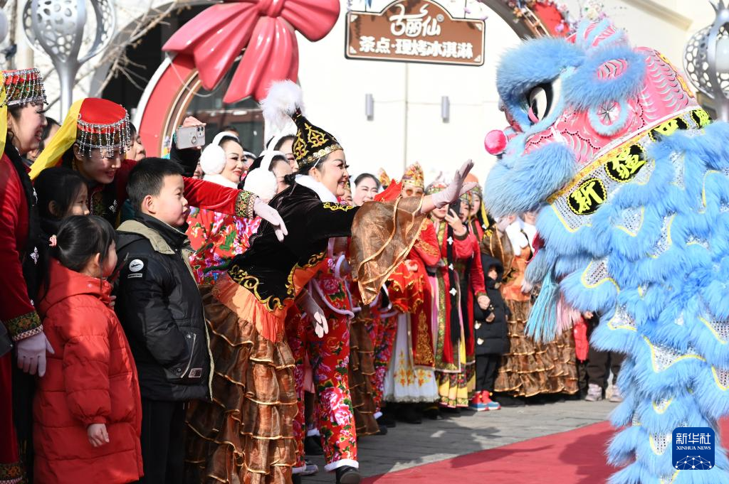 2026年1月1日,在新疆乌鲁木齐大巴扎步行街,舞狮队员与观众互动。