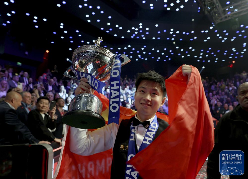 2025年5月5日,赵心童在颁奖仪式后庆祝。当日,在英国谢菲尔德举行的2025年斯诺克世锦赛决赛中,中国选手赵心童18比12战胜威尔士选手威廉姆斯,成为首位获得该项赛事冠军的亚洲选手。新华社发(翟政摄)