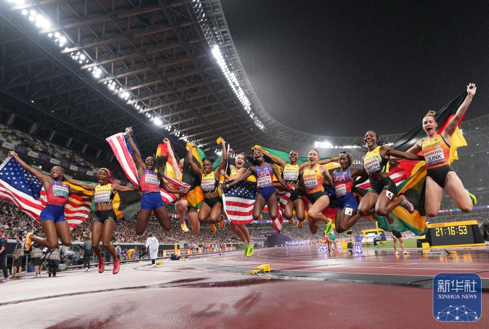 2025年9月21日,冠军美国队、亚军牙买加队和季军德国队在决赛后庆祝。当日,2025年世界田径锦标赛女子4x100米接力决赛在日本东京举行。新华社记者 鞠焕宗 摄