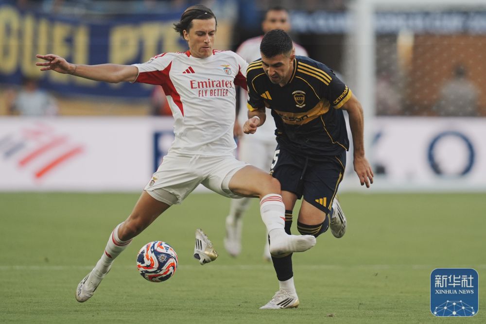 2025年6月16日,本菲卡队球员阿尔瓦罗·费尔南德斯(左)防守博卡青年队球员巴塔利亚时球靴掉落。当日,在美国迈阿密进行的2025年国际足联俱乐部世界杯(世俱杯)C组小组赛中,阿根廷博卡青年队2比2战平葡萄牙本菲卡队。新华社记者 黄宗治 摄