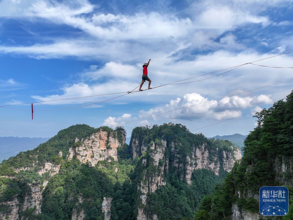 2025年8月18日,一名参赛选手在比赛中(无人机照片)。当日,2025张家界国家森林公园黄石寨景区“亚洲之王”千米高空扁带争霸赛开赛,来自中国、法国、德国、美国等10个国家和地区的20名顶尖选手参赛。新华社发(郭立亮 摄)