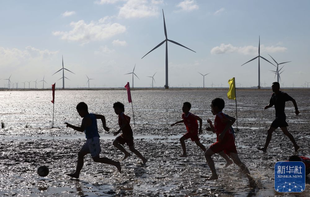 2025年7月23日,小球员们在比赛中拼抢。当日,为期三天的“滩涂少年·足梦飞扬——2025首届江苏青少年滩涂足球争霸赛暨第八届如东小洋口滩涂足球赛”在如东小洋口旅游度假区“海上迪斯科”滩涂赛场开赛,来自常州、泰州、扬州、南通等江苏8个城市的100名青少年足球健儿参赛。新华社发(许丛军摄)