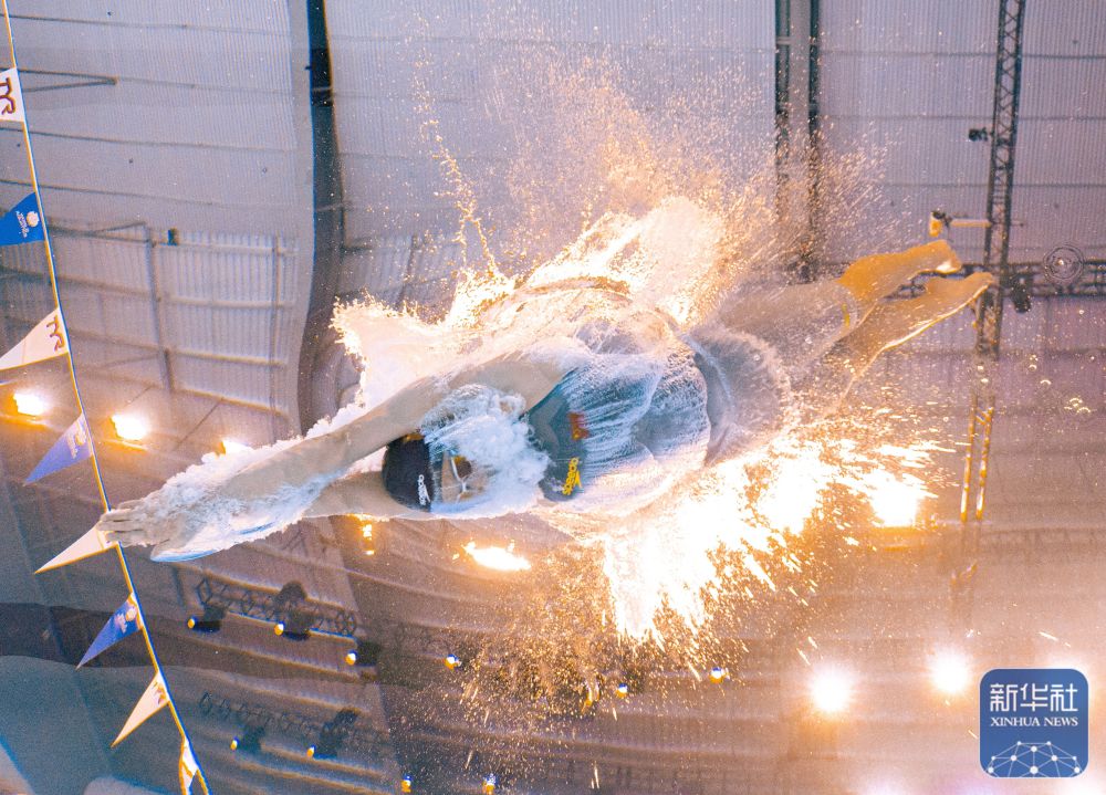 2025年8月3日,中国选手于子迪在比赛中出发。最终,她获得第四名。当日,2025年世界游泳锦标赛女子400米个人混合泳决赛在新加坡举行。新华社记者 薛宇舸 摄