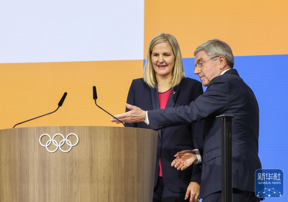 2025年3月20日,巴赫(右)邀请国际奥委会新一任主席考文垂上台致辞。当日,在希腊纳瓦里诺海岸举行的国际奥委会第144次全会中,考文垂当选国际奥委会新一任主席。新华社记者 曹灿 摄