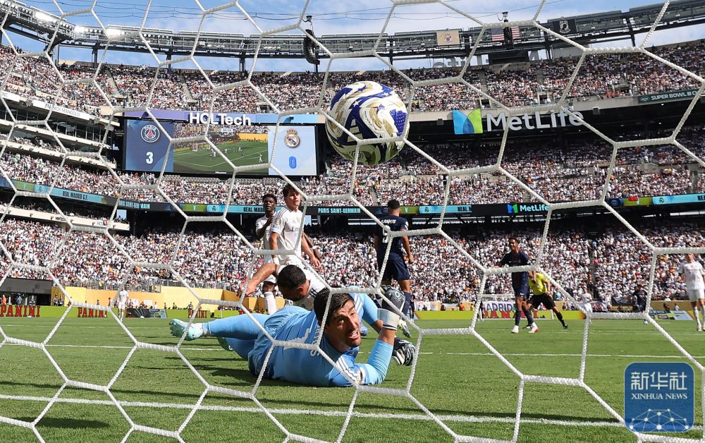 2025年7月9日,皇家马德里队门将库尔图瓦(前)未能扑出巴黎圣日耳曼队球员贡萨洛·拉莫斯为球队打进的第四粒进球。当日,在美国新泽西州进行的2025年国际足联俱乐部世界杯(世俱杯)半决赛中,法国巴黎圣日耳曼队4比0战胜西班牙皇家马德里队,晋级决赛。新华社记者 李明 摄