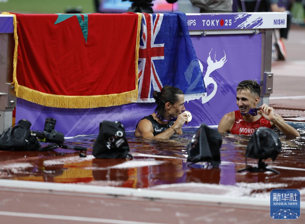 2025年9月15日,冠军新西兰选手比米什(左)和亚军摩洛哥选手艾尔巴卡里在赛后跳进水池庆祝。当日,2025年世界田径锦标赛男子3000米障碍赛决赛在日本东京举行。新华社记者 王丽莉 摄