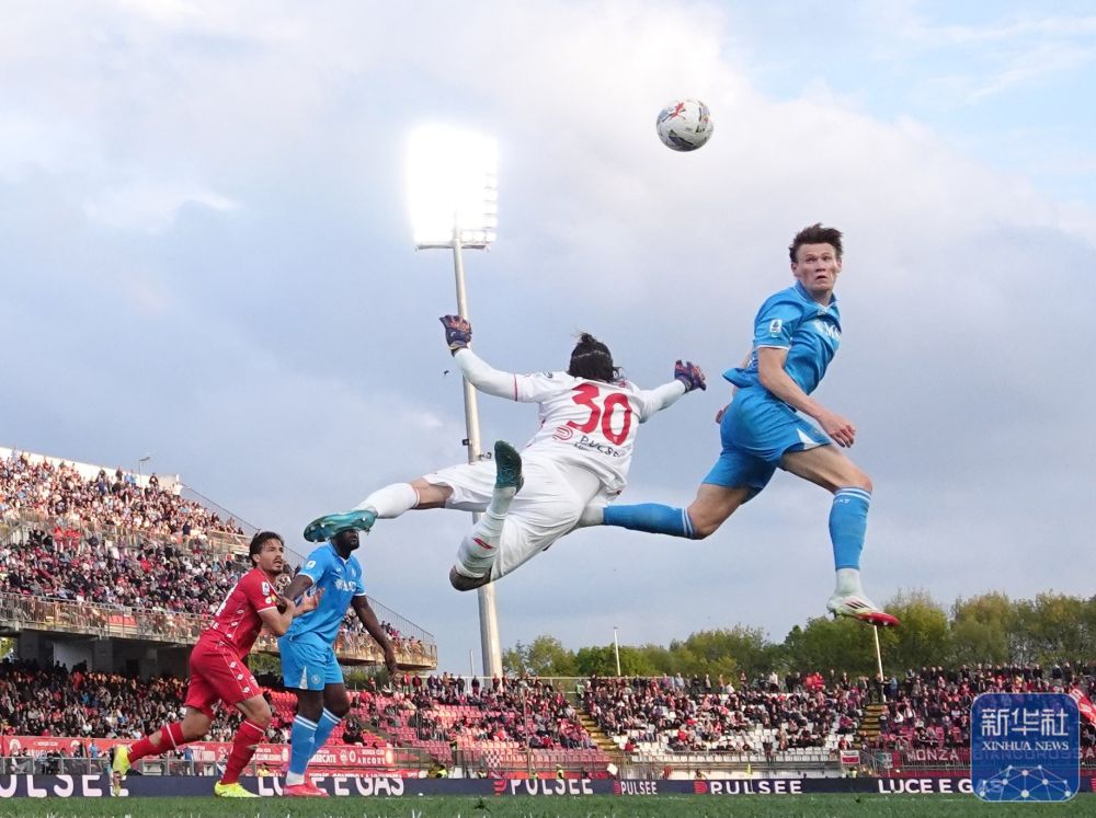 2025年4月19日,那不勒斯队球员麦克托米奈(右)在比赛中头球得分。当日,在2024-2025赛季意大利足球甲级联赛第33轮比赛中,那不勒斯队客场1比0战胜蒙扎队。新华社发(阿尔贝托·林格利亚摄)