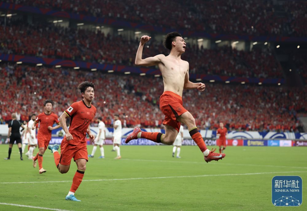 2025年6月10日,中国队球员王钰栋(右)罚进点球后庆祝。当日,在重庆举行的2026年美加墨世界杯亚洲区预选赛18强赛C组第十轮比赛中,中国队主场1比0战胜巴林队。新华社记者 胡星宇 摄