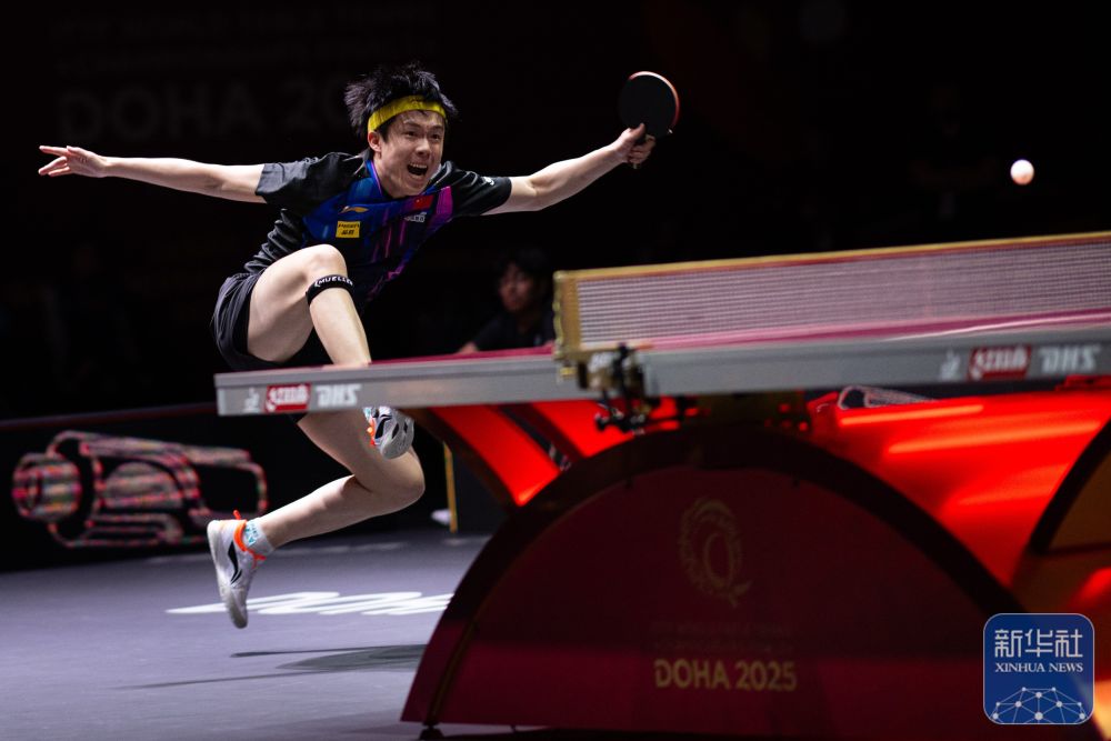 2025年5月23日,王楚钦在比赛中回球。当日,在卡塔尔多哈举行的2025年世界乒乓球锦标赛男子单打四分之一决赛中,中国选手王楚钦4比0战胜中国台北选手林昀儒,晋级四强。新华社记者 肖艺九 摄