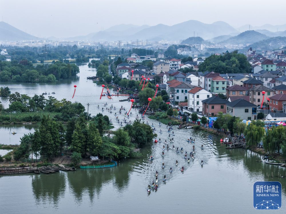 2025年10月26日,参赛选手在桨板比赛中(无人机照片)。当日,2025白塔湖湿地皮划艇桨板邀请赛在浙江省诸暨市店口镇白塔湖国家湿地公园举行,来自全国的250多名皮艇及桨板运动爱好者参加了本次比赛。新华社记者 徐昱 摄