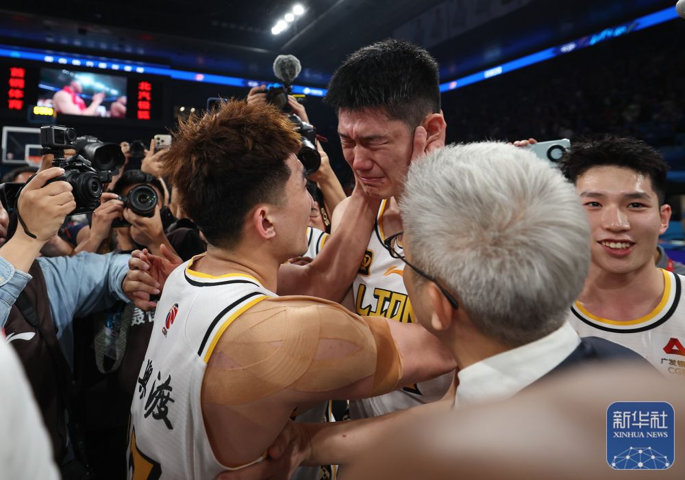 2025年5月20日,浙江方兴渡队球员孙铭徽(左一)与队友胡金秋(左二)庆祝夺冠。当日,在2024-2025赛季中国男子篮球职业联赛(CBA)总决赛第六场比赛中,浙江方兴渡队客场125比118战胜北京北汽队,总比分4比2夺得冠军。新华社记者 王楷焱 摄