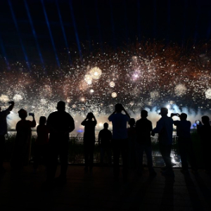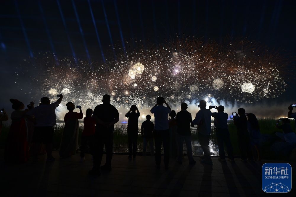 2025年8月7日,观众在开幕式上拍摄焰火表演。当日,第12届世界运动会开幕式在成都举行。新华社记者 江汉 摄