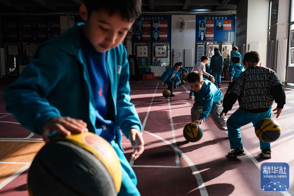 2025年2月24日,在新疆乌鲁木齐市第一小学,学生在体育课上练习篮球运球。自2025年春季学期起,乌鲁木齐义务教育阶段学校一至九年级体育与健康课程设置调整为每天1课时,一般课间时间由10分钟延长至15分钟,学生每天校内综合体育活动时间不低于2小时。新华社发(徐锐 摄)