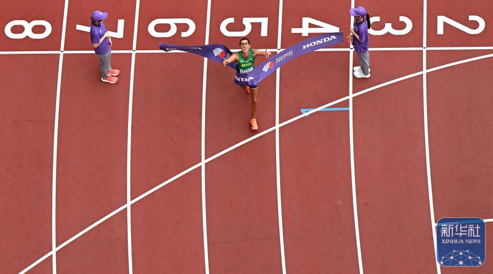 2025年9月20日,巴西选手邦芬冲过终点。最终,他获得冠军。当日,2025年世界田径锦标赛竞走男子20公里决赛在日本东京举行。新华社记者 李明 摄