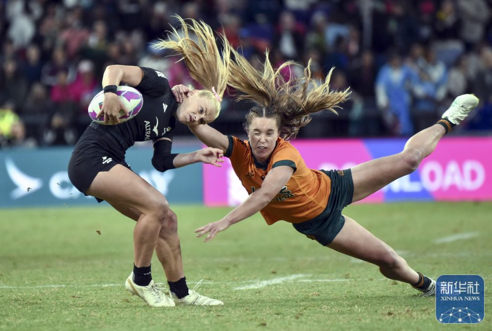 2025年3月30日,新西兰队球员米勒(左)与澳大利亚球员海因兹在比赛中拼抢。当日,在香港启德体育园主场馆举行的香港国际七人橄榄球赛女子决赛中,新西兰队26比19战胜澳大利亚队,获得冠军。新华社发(卢炳辉摄)