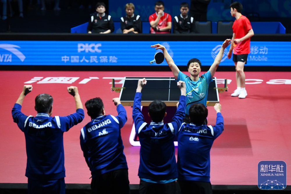 2025年11月20日,北京队选手马龙(中)庆祝男单比赛获胜。他3比0战胜上海队选手周恺。当日,在澳门进行的第十五届全国运动会乒乓球男子团体金牌赛中,北京队3比1战胜上海队,夺得冠军。新华社发(张金加 摄)