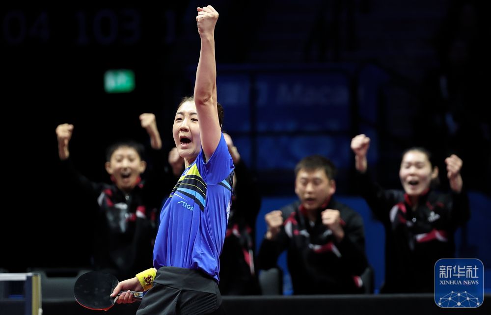 2025年11月19日,山东队选手陈梦在女单比赛中庆祝获胜。她3比0战胜河北队选手王添艺。当日,在澳门举行的第十五届全国运动会乒乓球女子团体金牌赛中,山东队3比2战胜河北队,夺得冠军。新华社记者 梁旭 摄