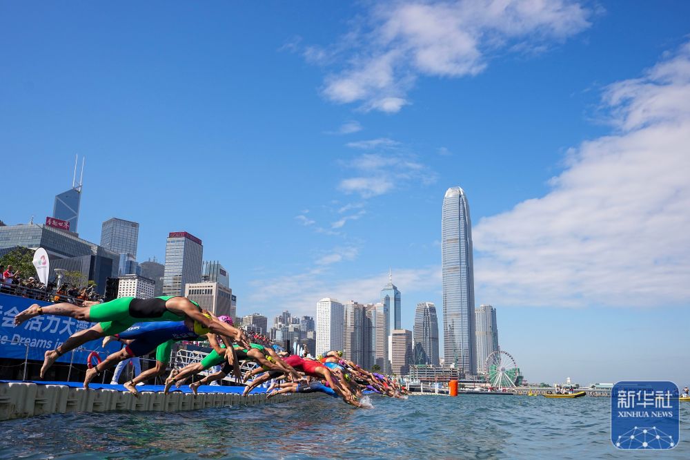 2025年11月15日,参赛选手在比赛中入水。当日,第十五届全国运动会铁人三项男子个人比赛在香港举行。新华社发(吕小炜摄)