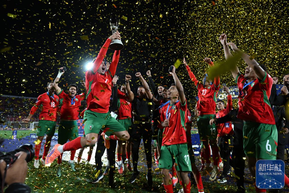 2025年10月19日,摩洛哥队在颁奖仪式上庆祝。当日,在智利圣地亚哥进行的2025国际足联U20男足世界杯决赛中,摩洛哥队2比0战胜阿根廷队,获得冠军。新华社发(豪尔赫·比列加斯摄)