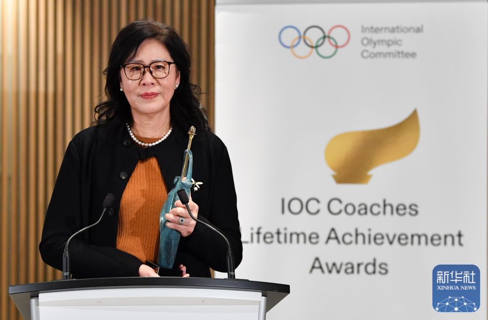 2025年11月24日,郎平在获奖后发表获奖感言。当日,前中国女排国家队主教练郎平在国际奥委会总部获颁2025年度国际奥委会教练员终身成就奖。与她一起获得该奖项的还有古巴摔跤教练迪亚兹。新华社记者 连漪 摄