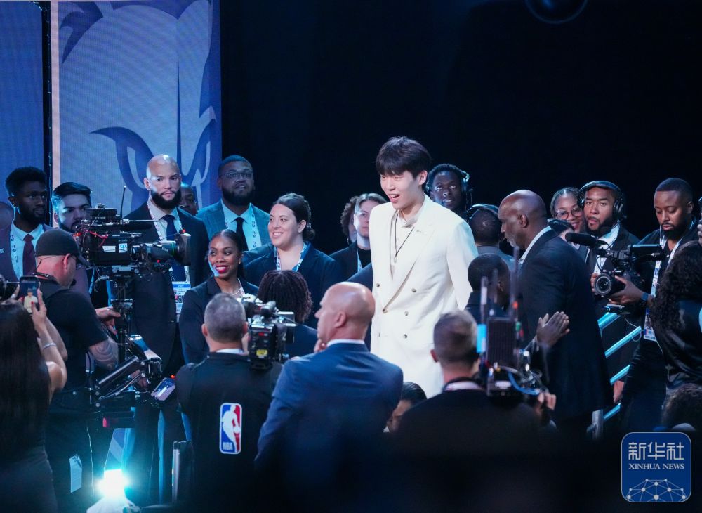 2025年6月25日,杨瀚森在新秀选拔大会现场登上中央舞台。当日,在2025年美职篮(NBA)新秀选拔大会首轮选拔中,波特兰开拓者队用从孟菲斯灰熊队交易得到的第16号签,选中中国球员杨瀚森。新华社发(孙宇轩摄)