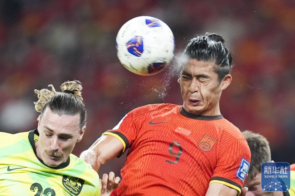 2025年3月25日,中国队球员张玉宁(左二)与澳大利亚队球员杰克逊·欧文(左一)在比赛中争顶。当日,在浙江杭州举行的2026美加墨世界杯亚洲区预选赛18强赛C组第八轮比赛中,中国队主场0比2不敌澳大利亚队。新华社记者 黄宗治 摄