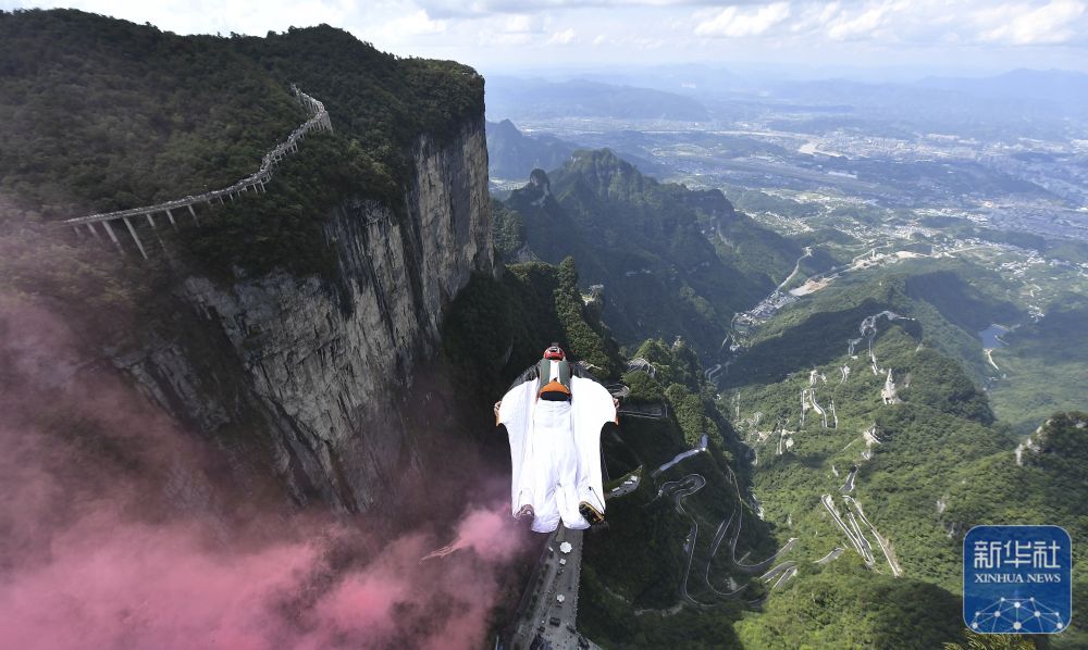 2025年9月16日,翼装飞行运动员在进行竞速赛比赛。当日,2025年第十一届翼装飞行世界锦标赛在湖南省张家界天门山景区正式开赛,来自中国、美国、澳大利亚等全球9个国家的16名翼装飞行运动员齐聚天门山,在奇峰险壑间进行大回环竞速赛和精准穿靶赛的激烈角逐。新华社发(邵颖摄)