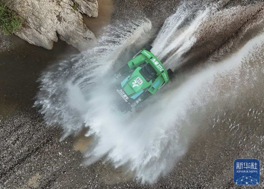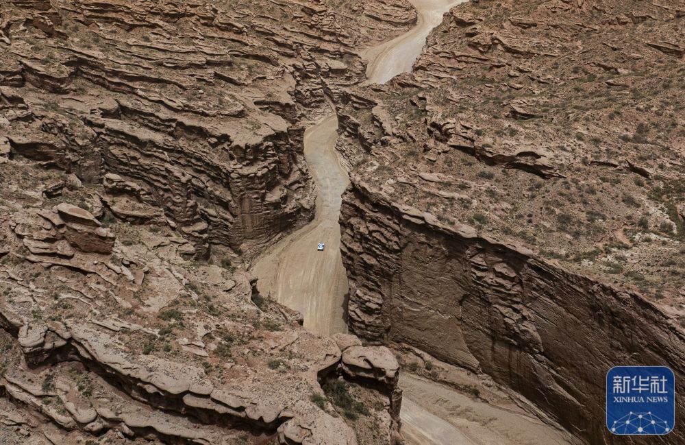 2025年5月23日,河北迁安九江汽摩运动俱乐部车手赵玉乔、领航员桂海波驾驶赛车在比赛中(无人机照片)。当日,2025中国环塔国际拉力赛第三赛段比赛在新疆阿克苏地区柯坪县进行。该赛段长330多公里,以狭窄涉水峡谷、戈壁等地形地貌为主。新华社记者 胡虎虎 摄
