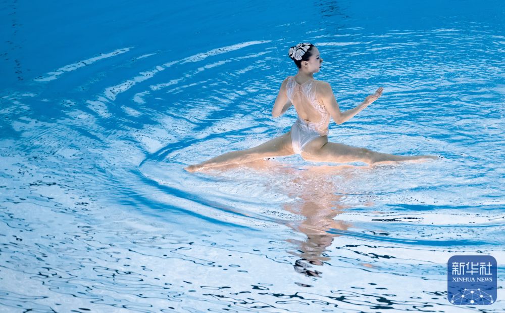 2025年7月19日,中国选手徐汇妍在比赛中(照片经过180°旋转)。当日,在新加坡举行的2025年世界游泳锦标赛花样游泳女子单人技术自选决赛中,中国选手徐汇妍获得冠军。这是中国队在本届世锦赛获得的首枚金牌。新华社记者 夏一方 摄
