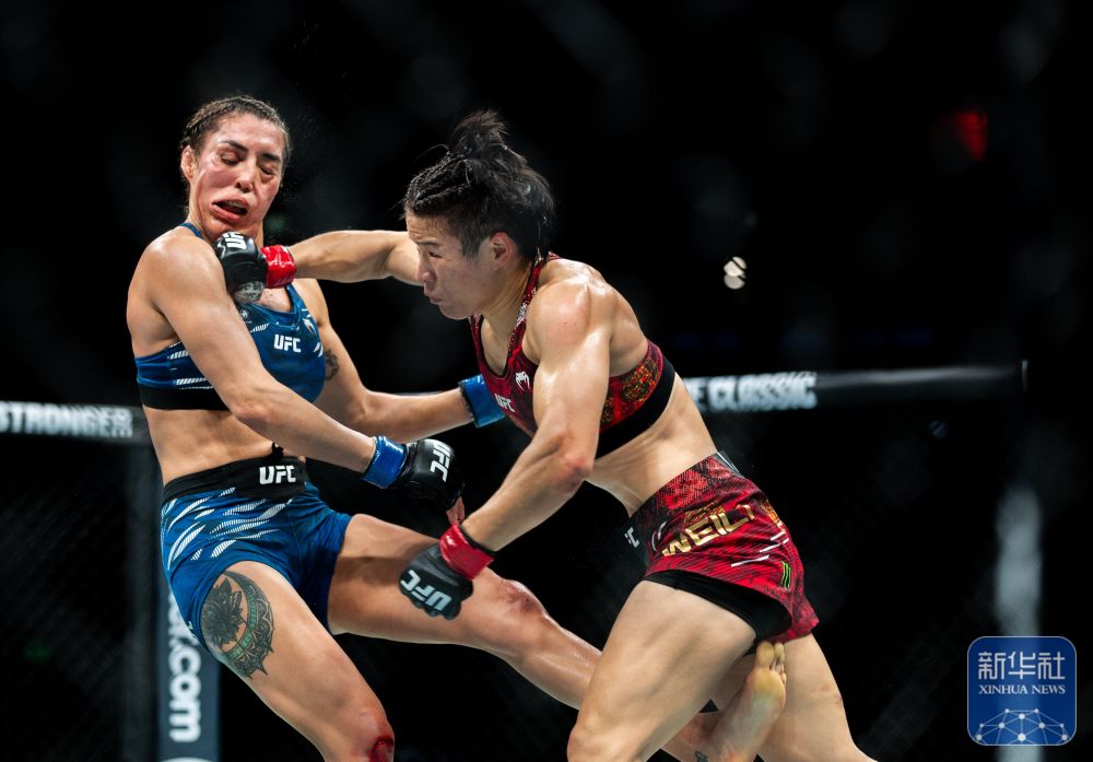 2025年2月9日,张伟丽(右)和苏亚雷斯在比赛中。当日,在澳大利亚悉尼举行的终极格斗冠军赛UFC312比赛中,中国选手张伟丽战胜美国选手苏亚雷斯,卫冕金腰带。新华社发(胡泾辰摄)