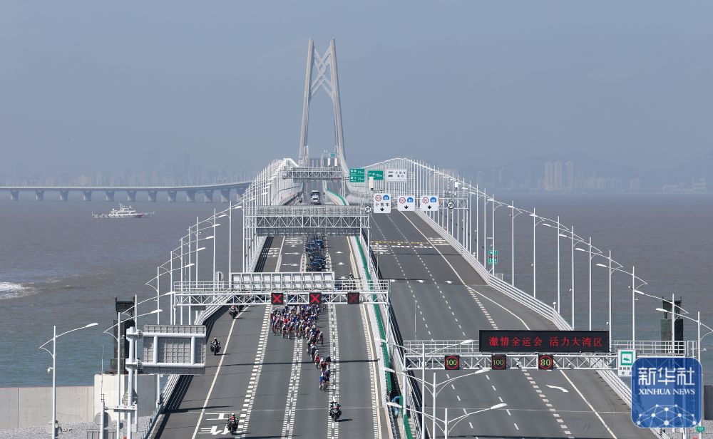 2025年11月8日,参赛选手在港珠澳大桥骑行。当日,第十五届全国运动会公路自行车男子个人赛决赛开赛,全程231.8公里,选手经过港珠澳大桥,跨越粤港澳三地。这是全运会历史上首次举办跨境比赛。新华社记者 梁旭 摄