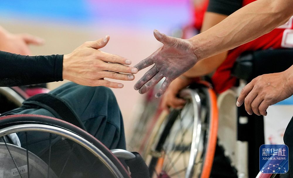 2025年12月9日,西藏队球员旦增(右)在赛后向对手致意。当日,在广州举行的全国第十二届残疾人运动会暨第九届特殊奥林匹克运动会轮椅篮球项目男子组小组赛中,辽宁队75比31战胜西藏队。新华社记者 吴鲁 摄