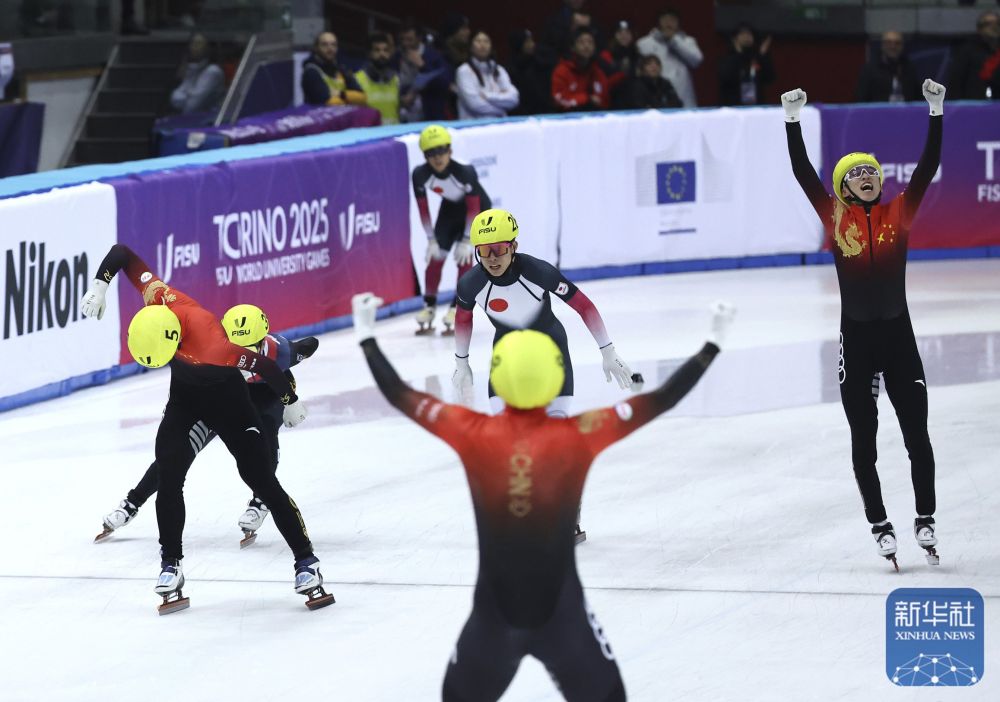 2025年1月23日,中国队选手李坤(左一)在比赛中率先撞线后与队友庆祝。当日,在2025年都灵大冬会短道速滑男子5000米接力A组决赛中,由刘冠逸、宋桂旭、李坤、张添翼组成的中国队以6分57秒044的成绩夺得冠军。日本队和哈萨克斯坦队分获亚军和季军。新华社记者 张晨 摄