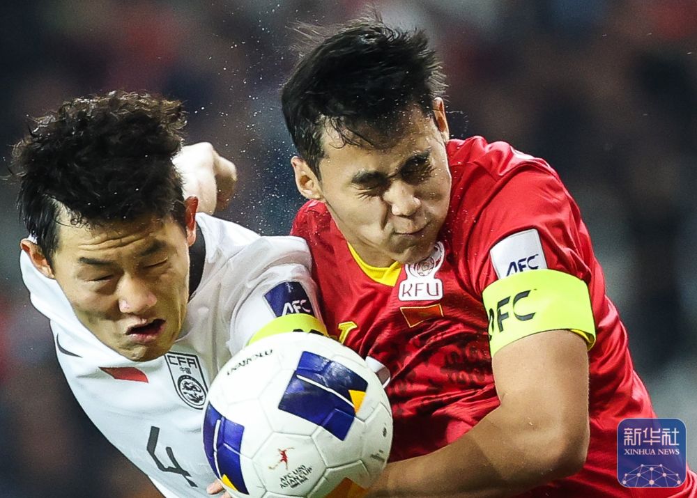 2025年2月15日,中国队球员史松宸(左)与吉尔吉斯斯坦队球员克德尔沙耶夫在比赛中争顶。当日,在深圳举行的2025亚足联U20亚洲杯小组赛中,中国队5比2战胜吉尔吉斯斯坦队。新华社记者 刘大伟 摄