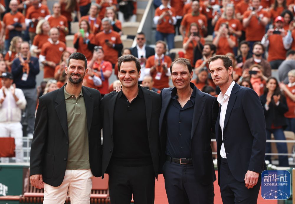 2025年5月25日,焦科维奇、费德勒、纳达尔和穆雷(从左至右)在致敬仪式上合影。当日,2025年法国网球公开赛为西班牙网球运动员纳达尔举行致敬仪式。2024年11月19日,纳达尔在戴维斯杯网球赛总决赛四分之一决赛后正式退役。他共获得22个大满贯单打冠军,在法国网球公开赛上14次夺冠,是当之无愧的“红土之王”。新华社记者 李京 摄