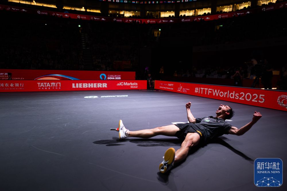 2025年5月24日,雨果·卡尔德拉诺在赛后庆祝。当日,在卡塔尔多哈举行的2025年世界乒乓球锦标赛男子单打半决赛中,巴西选手雨果·卡尔德拉诺4比3战胜中国选手梁靖崑,晋级决赛。新华社记者 肖艺九 摄