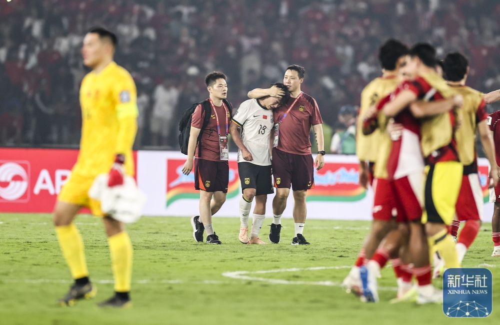 2025年6月5日,中国队球员胡荷韬(后中)在比赛后。当日,在印度尼西亚雅加达举行的2026年世界杯亚洲区预选赛18强赛C组第九轮比赛中,中国队客场0比1不敌印度尼西亚队,无缘美加墨世界杯正赛。新华社记者 贾浩成 摄