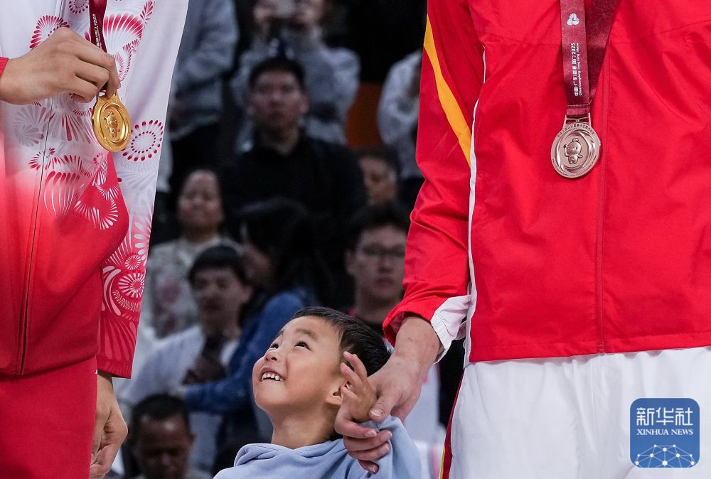 2025年11月12日,四川队球员周琦(右)的孩子看着广东队球员沈梓捷(左)的金牌。当日,在广东省东莞市举行的第十五届全国运动会篮球男子成年组决赛中,广东队101比65战胜浙江队,获得冠军。新华社记者 李博 摄
