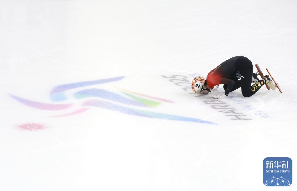 2025年2月9日,中国队选手范可新赛后亲吻冰面。当日,第九届亚冬会短道速滑女子3000米接力A组决赛在哈尔滨举行,中国队夺得冠军。新华社记者 许雅楠 摄